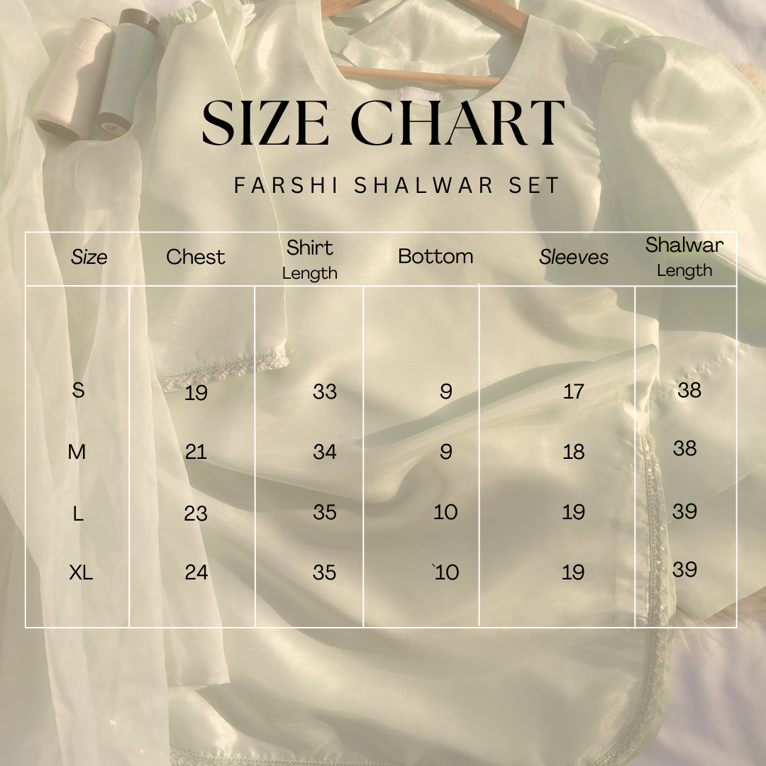 Farshi shalwar and shirt featuring a round daman, puffy sleeves with kat dana lace, and paired with an organza dupatta