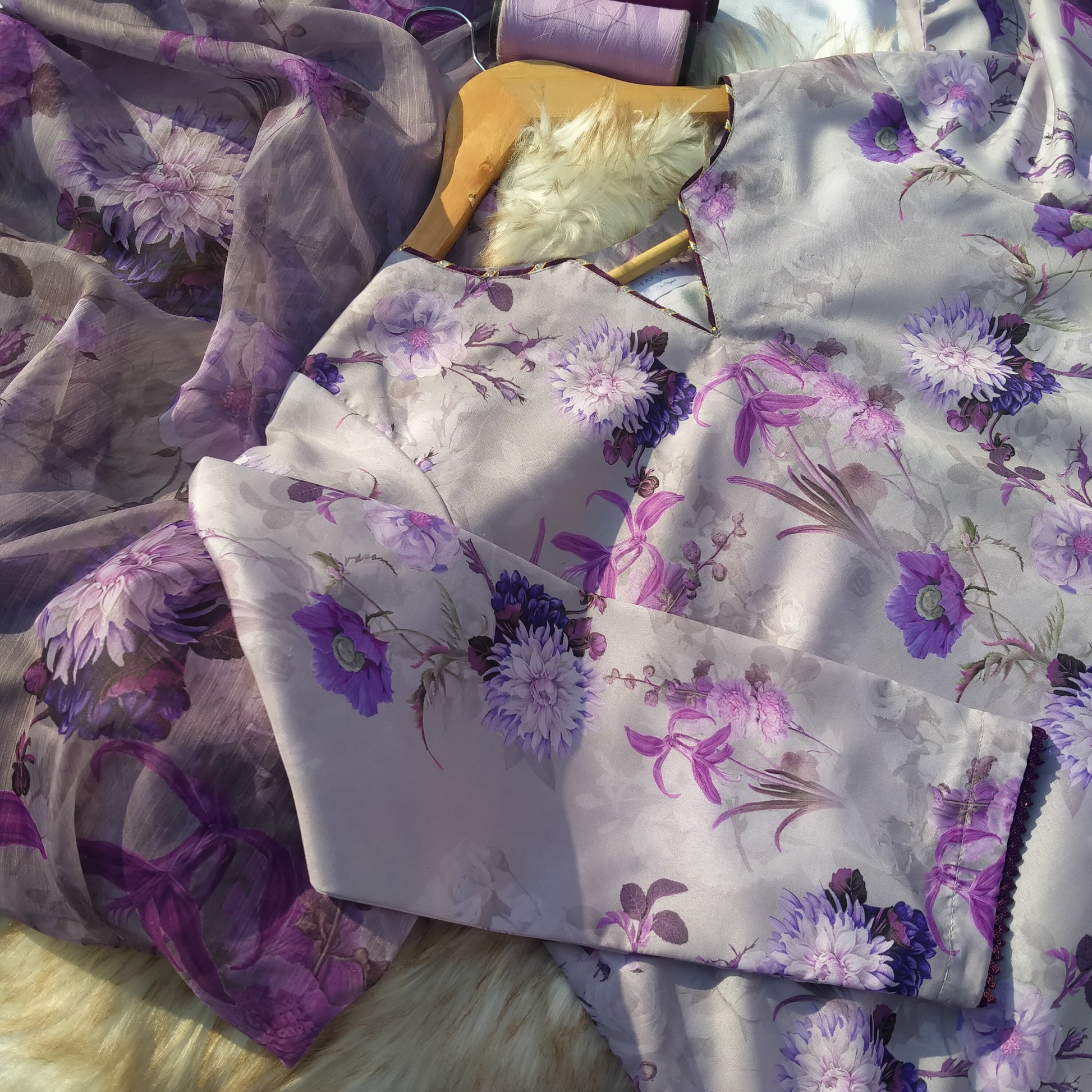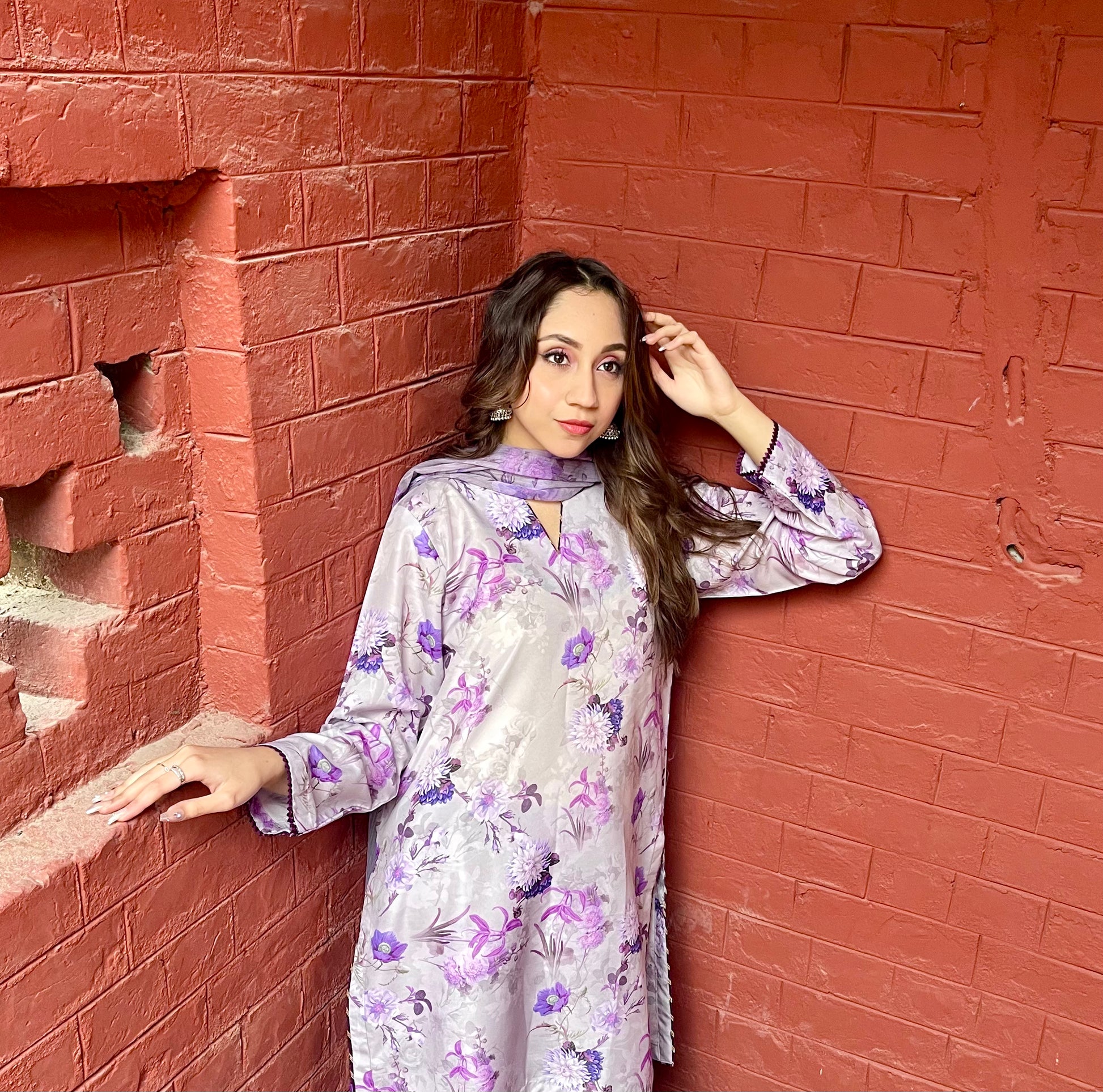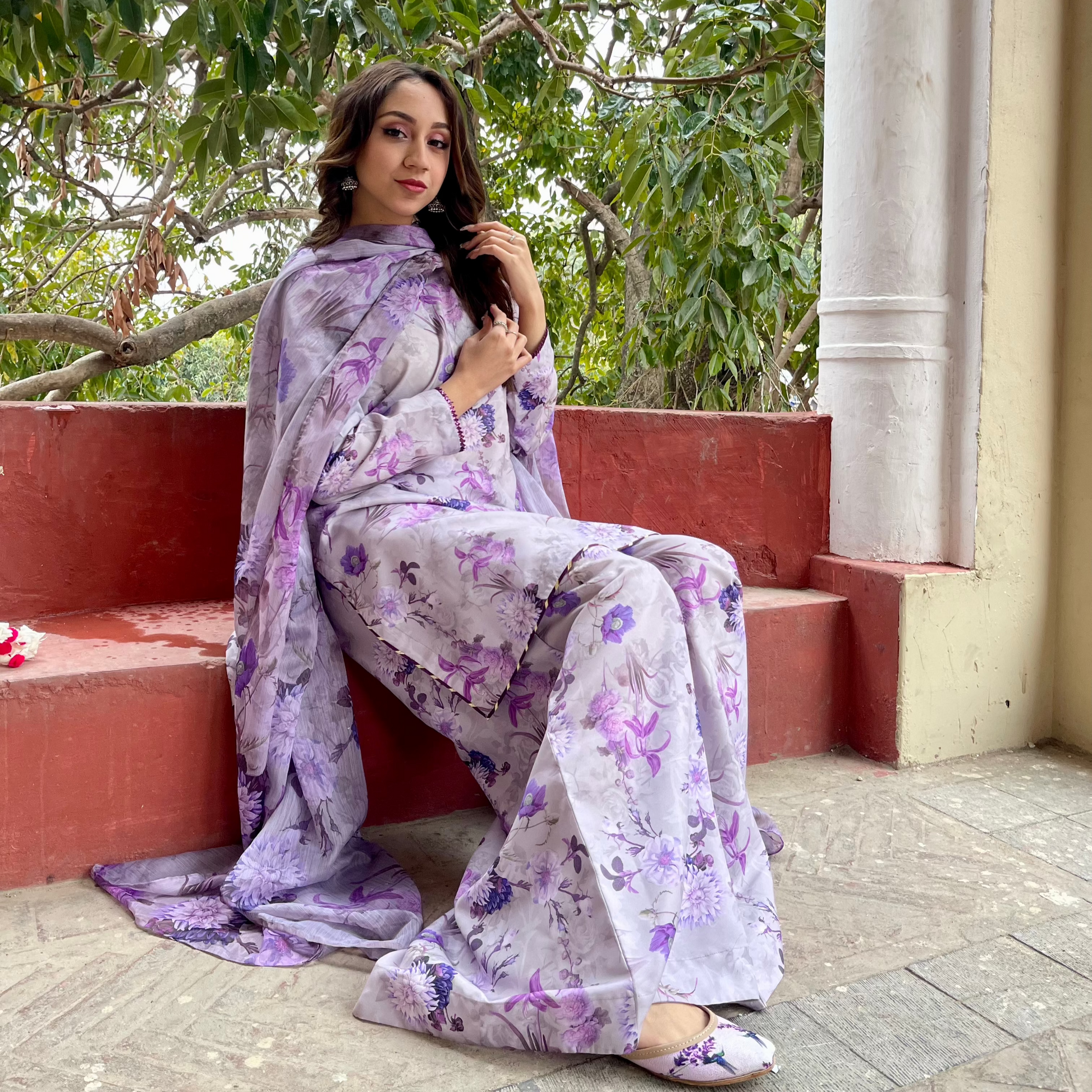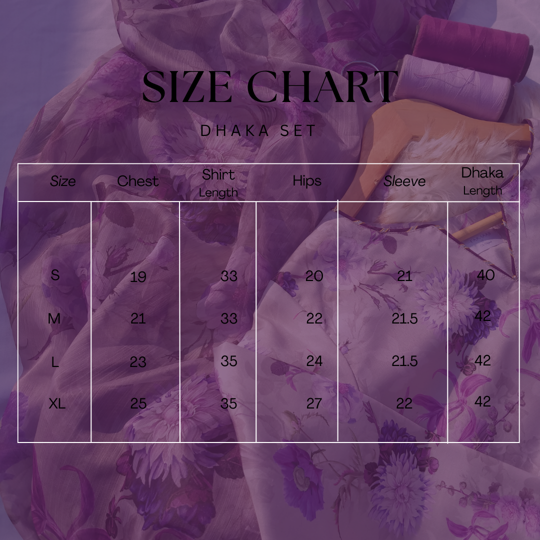 Dhaka pants and shirt featuring lace detailing on the neck, sleeves, and daman, paired with a printed chiffon dupatta.