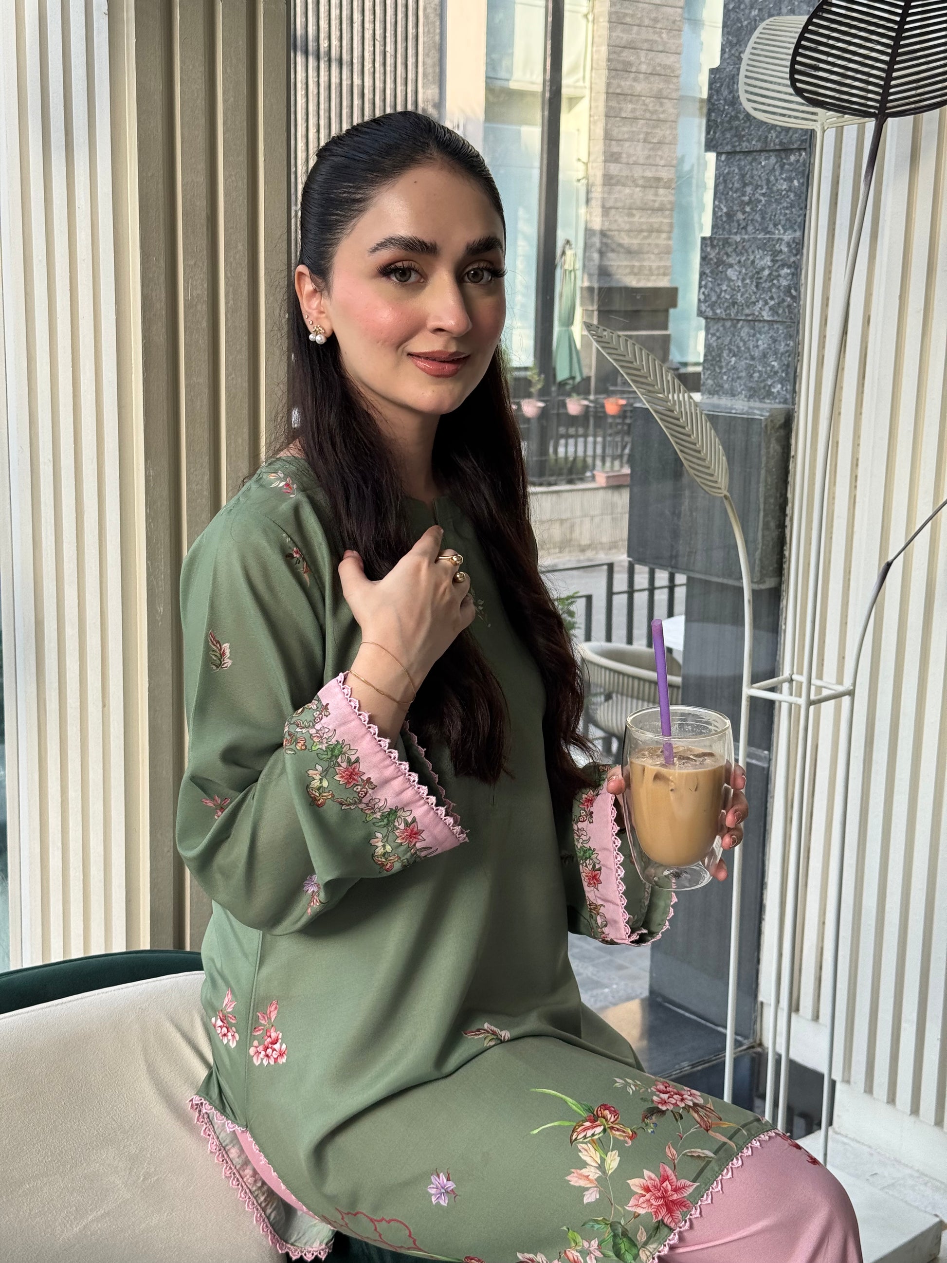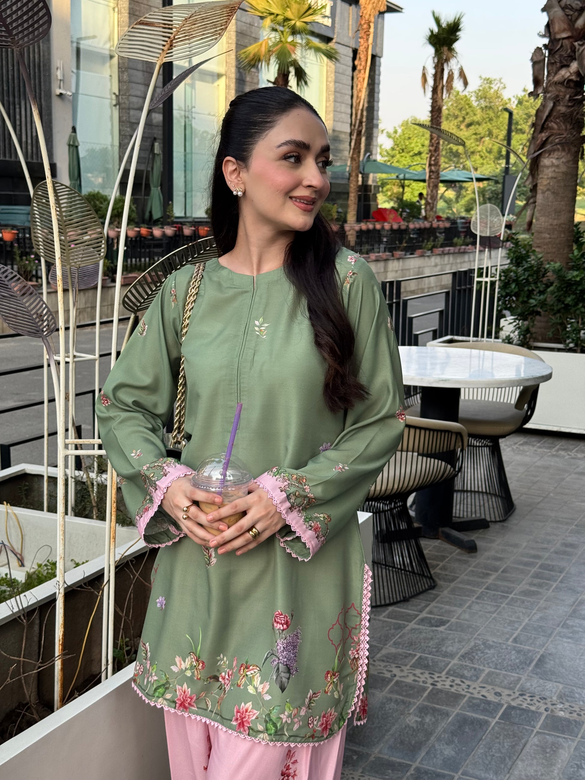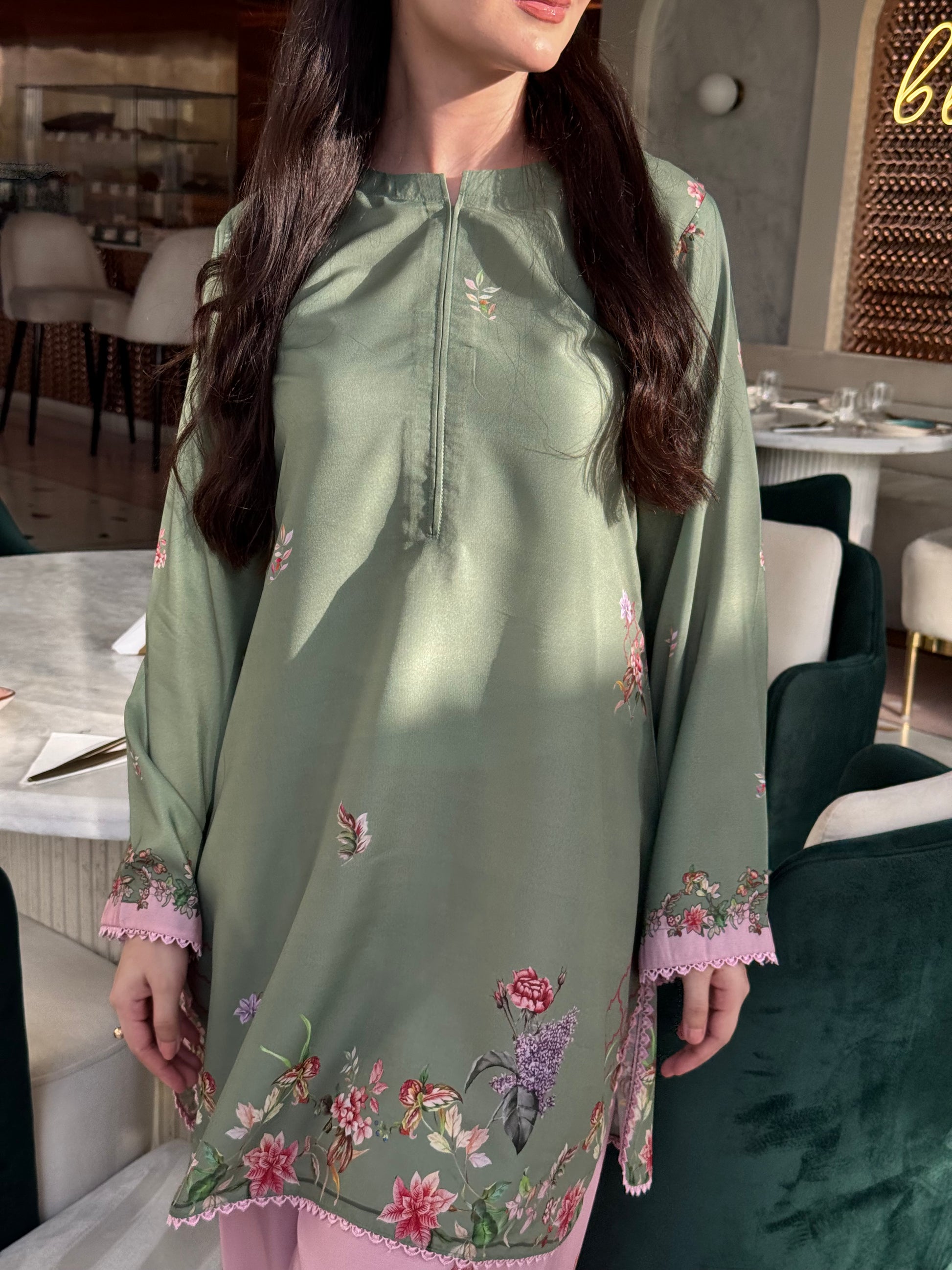 This two-piece outfit is super sweet in pistachio and pink with bright floral patterns. It has pretty lacing on the sleeves and hem and a neat finish at the neck.
