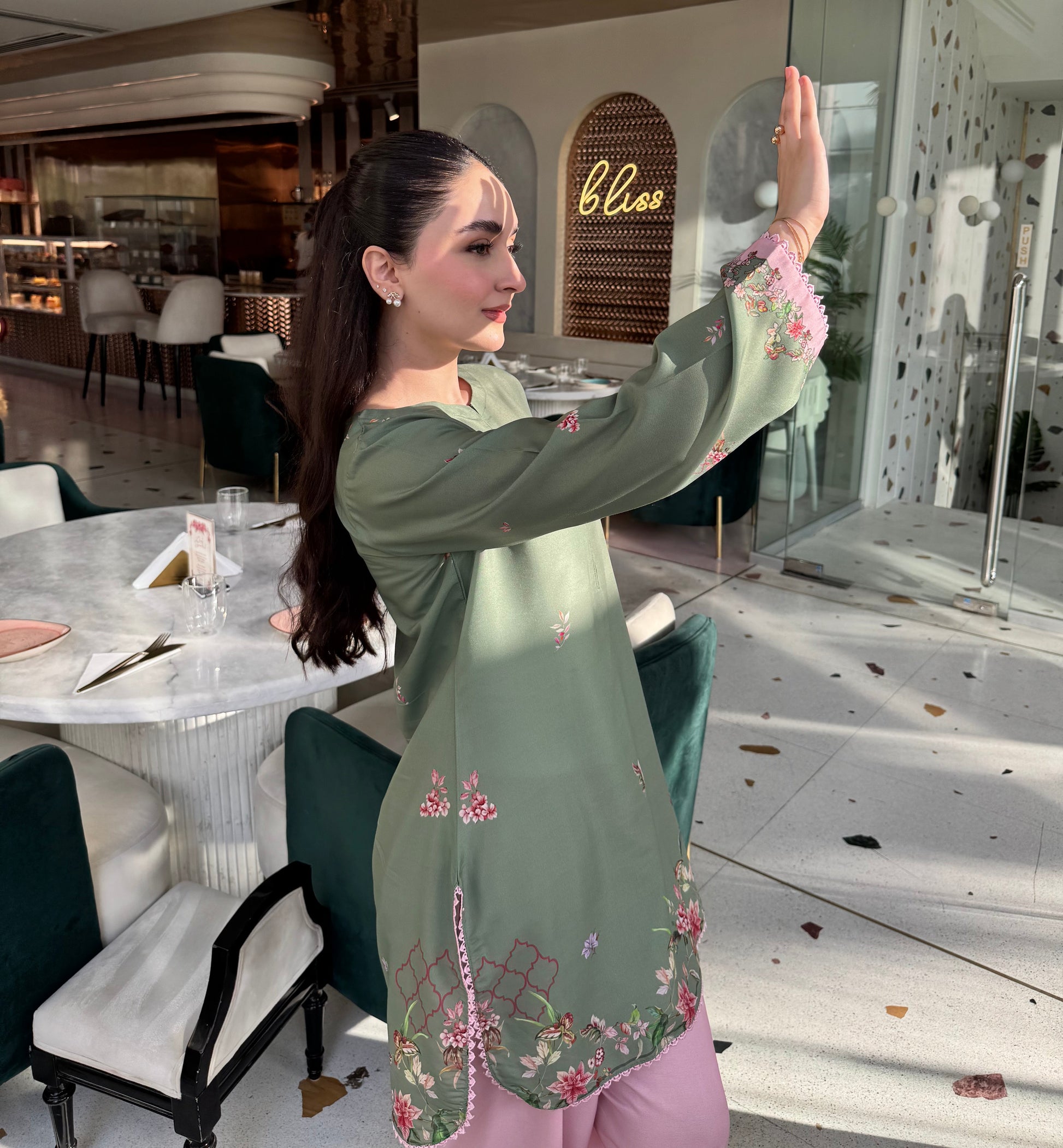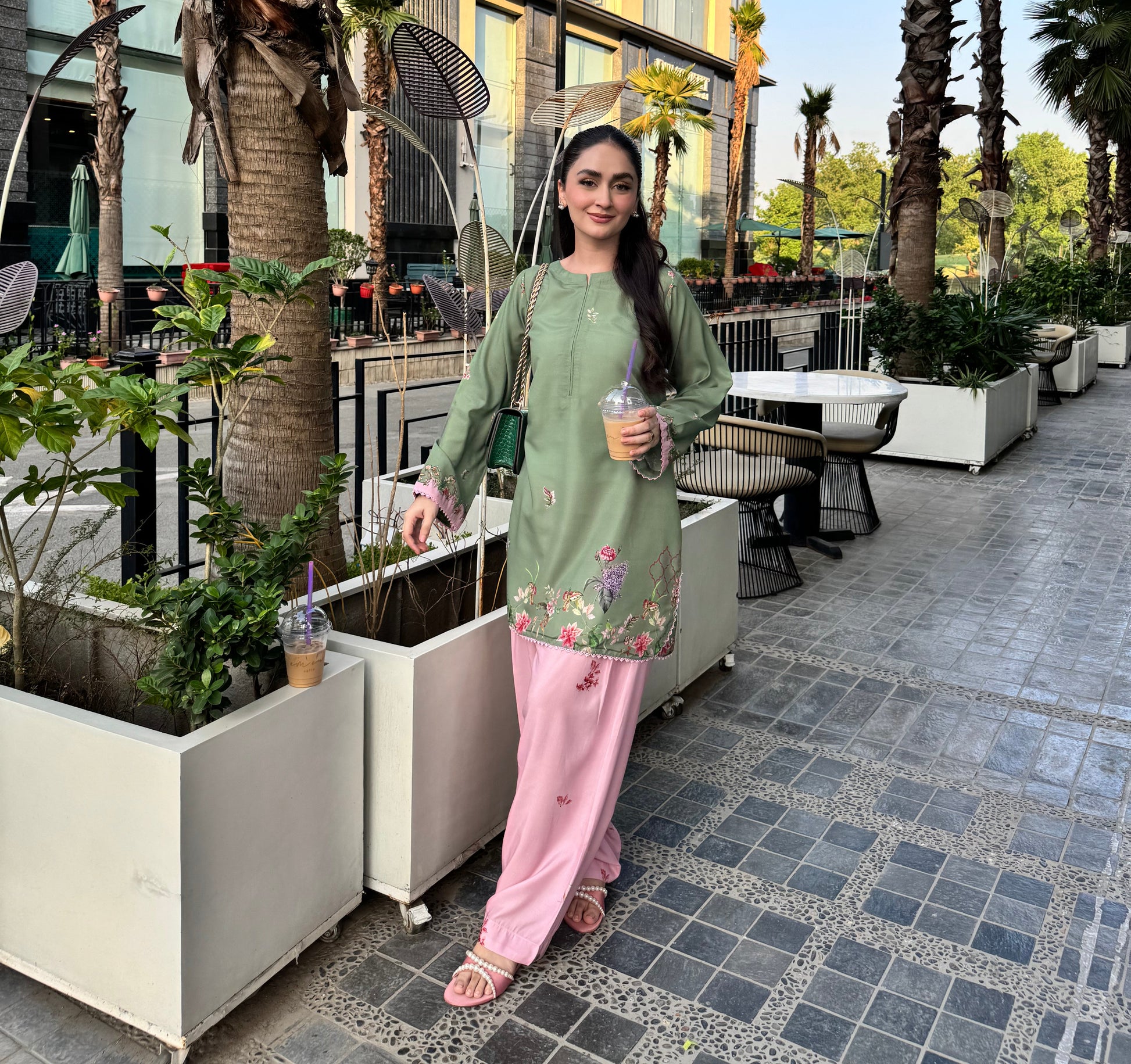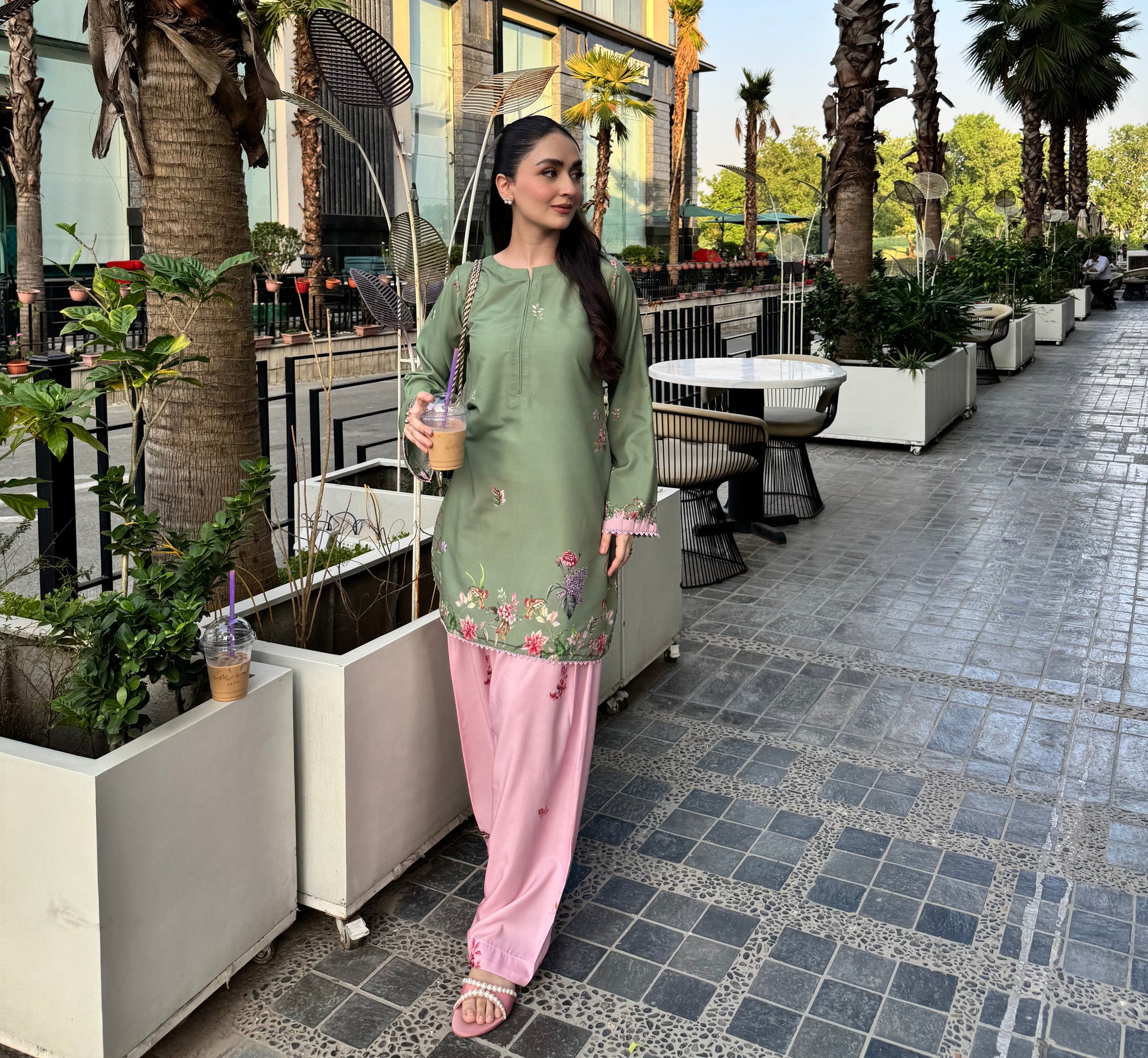 This two-piece outfit is super sweet in pistachio and pink with bright floral patterns. It has pretty lacing on the sleeves and hem and a neat finish at the neck.