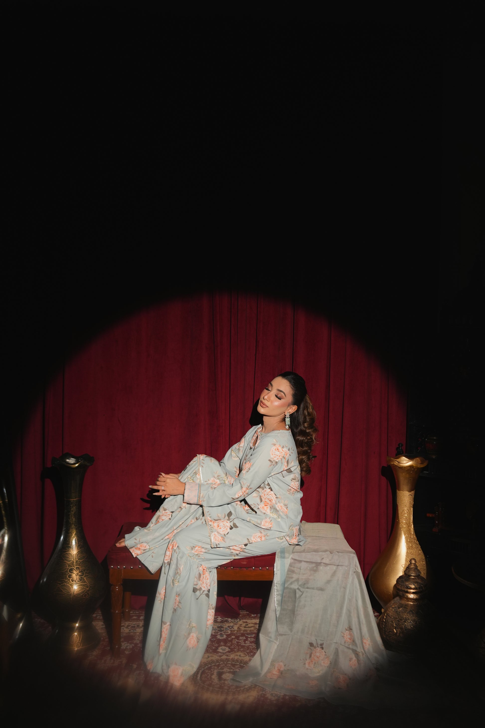 Description: Printed Gharara Set with detailing on neck, sleeves and daman, paired with a dupatta featuring four corner lace.